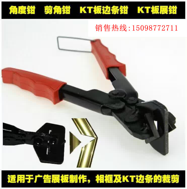KT板边条钳 直角钳 1、产品名称:边条钳/直角钳/展钳/KT板配件小边条直角钳/KT板配件小边条展钳 2、材质说明:铁质+塑胶,(大KT钳为例:长度:24CM,直角边长:3CM) 3、应用范围:主要用于广告展板制作行业。用于KT板小边条剪成90度角,边条不要超过1.5CM宽,均可以用 4、重量:0.5KG/把