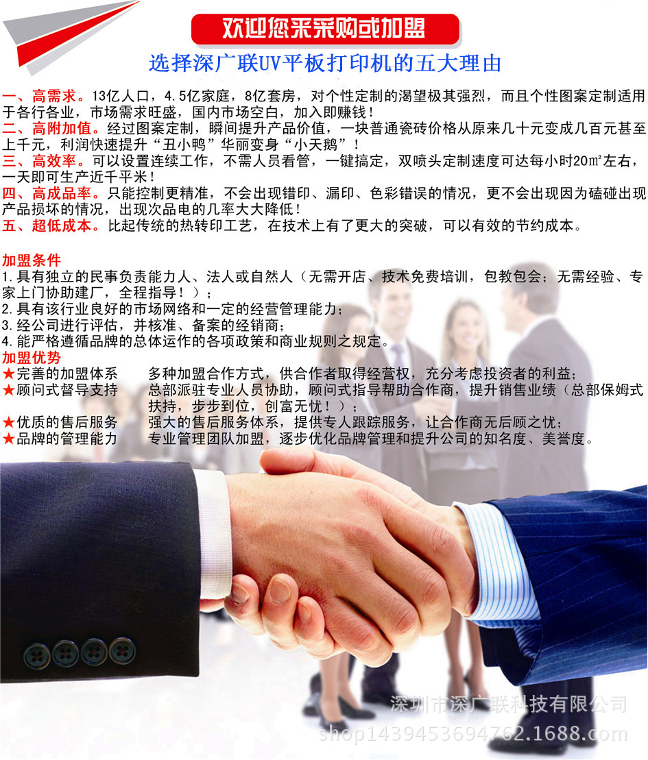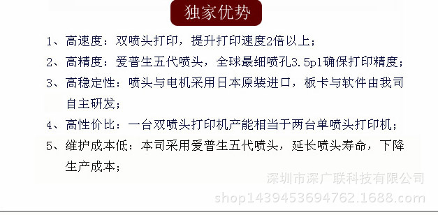 深圳市深广联科技有限公司主营UV平板喷绘机,UV平面打印机,UV卷材喷绘打印机,UV平板立体印刷导带机,平板打印机,同步双面喷绘机等喷印设备,长期供应配件及耗材厂家。月底促销,欢迎前来打样!