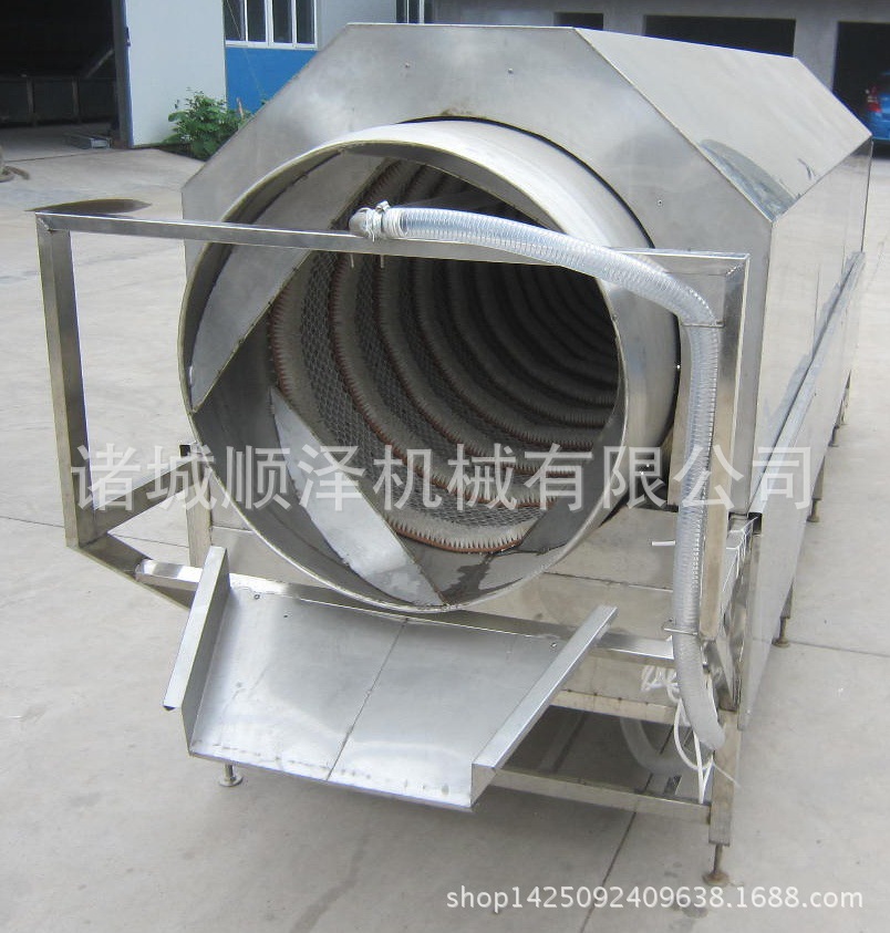 5.自动控温,变频调速,筒体分为两部分,前半部采用加洗洁精处理方法,后半部采用清水自动清洗一遍。滚筒内有毛刷,螺旋进料出料。