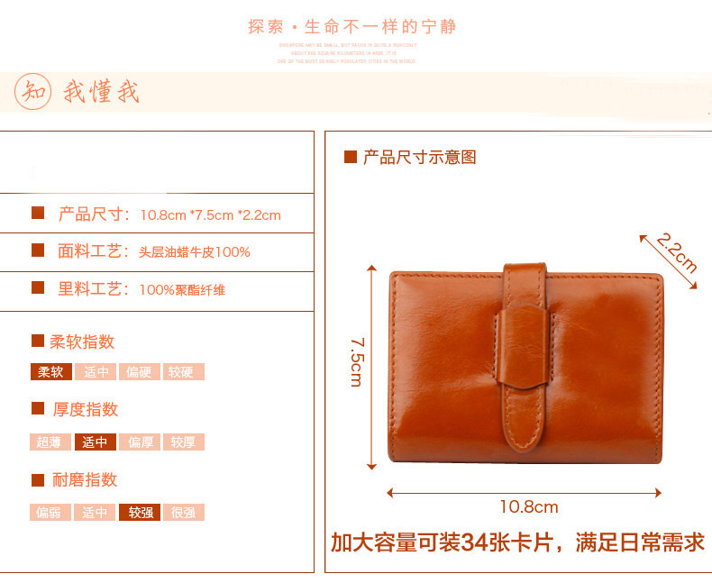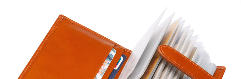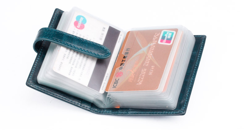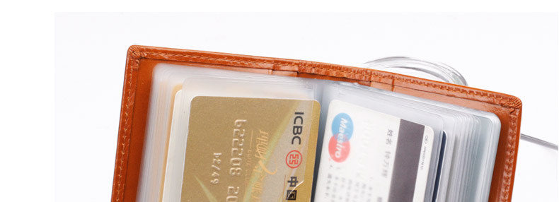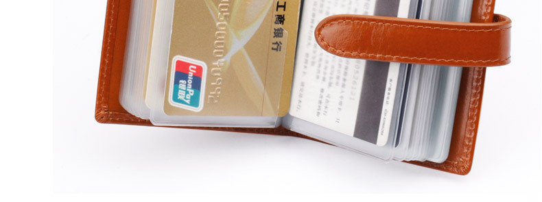 产品特点: | 34个卡位 1个证件位 携带方便 方便装取卡 真皮柔软的质感 光泽高档 |