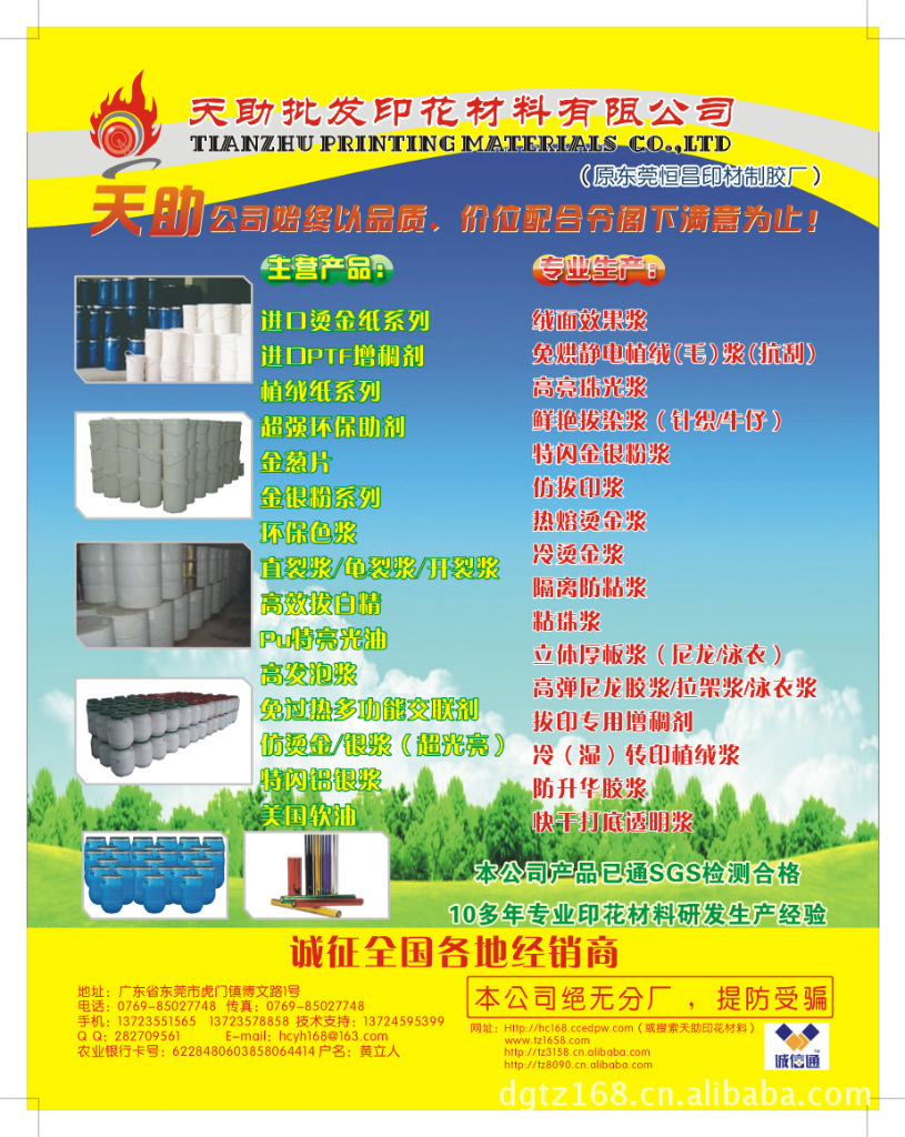 供应╭(+﹏+)~【配技术顾问】天助TZ-环保SF感光胶╭(+﹏+)~供应╭(+﹏+)~【配技术顾问】天助TZ-环保SF感光胶╭(+﹏+)~供应╭(+﹏+)~【配技术顾问】天助TZ-环保SF感光胶╭(+﹏+)~供应╭(+﹏+)~【配技术顾问】天助TZ-环保SF感光胶╭(+﹏+)~供应╭(+﹏+)~【配技术顾问】天助TZ-环保SF感光胶╭(+﹏+)~供应╭(+﹏+)~【配技术顾问】天助TZ-环保SF感光胶╭(+﹏+)~供应╭(+﹏+)~【配技术顾问】天助TZ-环保SF感光胶╭(+﹏+)~供应╭(+﹏+)~【配技术顾问】天助TZ-环保SF感光胶╭(+﹏+)~ 溶剂类型分水性漆品牌恒昌牌颜色白色单件净重15(g)保质期12(个月) 感光胶:纺织品印刷用感光胶,与重氮敏化剂粉末分开,适用于水性油墨系统。呈蓝色,极为透明。做好的模版可二次暴光,以增强其机械强度和耐溶剂性能。曝光时间很短。生态学上可靠 l 天助公司(恒昌牌)的付款说明: l 建议选择支付宝或财付通(双方安全)。 l 支付宝帐号:282709561@qq.coml 可通过银行打款-l 中国农业银行卡号:6228 4806 0385 8064 414 户名:黄立人l 运输方式:l 速尔快递,龙邦快递,申通快递,韵达快递,顺丰速运,平安达快递,中通快递,量大可货运(也可由客户指定快递)l 广东省省内付款方式:快递公司可以代收货款,(也就是货到付款)。l 广东省省外付款方式:款到账后就发货。l 备注:l 样品免费试用(250克-400克),运费到付。l 10kg以上我方付运费。l 详情请加客服扣扣:282709561 690370305咨询!上述资料,仅供参考,不作法律依据。按“国际化工惯例”:每次使用前,客户必须试验确认后,方可批量投入使用,否则后果与我方无关。地址:中国、广东省、东莞市、虎门镇、博文路1号手机:13723578858方小姐 13723551565黄先生工作电话:0769-85027748 Ø 天助公司(恒昌牌)专业生产|代理销售|各种特殊特种|印花材料:Ø :环保高弹性防水尼龙白胶浆/环保高弹性防水尼龙透明浆/环保高弹性柔软白胶浆/透明浆,尼龙柔软白胶浆/透明浆,防水弹性尼龙胶浆,防升华防水白胶浆/透明浆,莱卡拉架白胶浆/透明浆,丝印专用打底透明浆,日本新中村白胶浆/透明浆,防火阻燃白胶浆/透明浆,仿硅胶浆,硅浆,机印弹性柔软白胶浆/透明浆,防火剂,白花浆,广告浆。Ø :水性立体厚板白胶浆/透明浆,尼龙水性立体白胶浆/尼龙水性立体透明浆,高效拔白精/拔印精,强力拔白粉/拔印粉,拔白浆/彩拔浆/拔印浆,针织/牛仔拔染浆,石磨牛仔洗水白胶浆/透明浆/彩印浆,牛仔浆,特强洗水牛仔胶浆,日本新中村加光浆,日本新中村固色剂,日本新中村隔离浆,尼龙固浆,防止烫金浆,Ø :抗氧化金银粉浆,意大利抗氧化金银粉浆,PU加光浆,特亮光油,水性嗜喱浆。PU光油。Ø :龟裂浆/裂纹浆,直裂浆/爆裂浆,冷烫金浆,台面烫金浆,热熔烫金浆,高牢度洗水烫金浆,台湾烫金浆,日本烫金浆。Ø :仿烫金(银)浆,可调色仿烫金浆,仿植绒浆,仿植毛浆,绒面效果浆,植毛植绒胶水,高效粘珠浆,高亮珍珠浆,铝银浆,特闪银浆,湿银粉,尼龙固浆,印花涂料色浆,水性色种,强力发泡浆,高软发泡浆。Ø 免过热耐洗水植毛(绒)浆,植毛专用胶水,760H植毛浆,328植绒浆,皮革植毛浆,强洗水植绒浆,抗刮植毛胶浆,550A植绒浆。Ø :水油两用感光胶圆角(直角)热固油墨,透明白色黑色绿色等颜色齐全。Ø :环保柔软特亮金葱浆,各种颜色(国产、进口)烫金纸,电化铝,意大利烫印纸,耐高温金葱粉(片),高温大红片(绿片),100多种颜色植绒(毛)转印纸。Ø :热熔粉,珍珠粉,超粘水(油)性台板胶,407印花水,628洗版水,洗板水,硬化水,架桥剂,TZ-100催化剂,防塞网剂,日本高力乳化剂,免过热多功能植毛绒交联剂,PTF印花增稠剂,柔软剂,美国软油,烫画机,烫金机,双工位汽动烫画机,晒版机,刮刀,码仔等!欢迎广大客户来电索样!顺颂商祺!Ø Ø Ø 天助公司始终以品质、价位配合令阁下满意为止! 1:公司网站:(http://hc168.ccedpw.com搜索东莞市天助印花材料)2:公司网站: www.tz1658.com3:公司网站:http://hcyh168.cn.alibaba.com/4:公司网站:http://hcyh168.b2b.hc360.com/5:公司网站:http://hc168.cn.nowec.com6:公司网站:http://hcyh168.cn.Toocle.com7:公司网站:http://hcyh168.cn.china.cn8:公司网站:http://hcyh168.cn.makepolo.com/9:公司网站:http://shop.paipai.com/28270956110:公司网站:http://hcyh168.taobao.com11:公司网站::http://tzyh168.51sole.com/12:公司网站:http://dgtz168.cn.china.cn13:公司网站:http://tz3158.cn.alibaba.com14:公司网站:http://tz8090.cn.alibaba.com15:公司网站:http://dgtz168.ccedpw.com16:公司网站:http://tz8090.ccedpw.com/产品相册: http://282709561.photo.qq.com电子邮件:hcyh168@163.com客服QQ:282709561 690370305 MSN帐号: Tz1682010@hotmail.com工作电话:0769- 8502 7748手机:137 2357 8858 137 2459 5399 137 2355 1565联系人:方小姐、黄先生旺旺:TZ8090 TZ3158 hcyh168 hcyh18东莞市天助批发印花材料有限公司(原恒昌印材制胶厂)