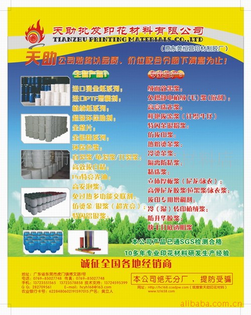 【卓越品质】天助TZ-环保感光胶系列【卓越品质】天助TZ-环保感光胶系列【卓越品质】天助TZ-环保感光胶系列【卓越品质】天助TZ-环保感光胶系列【卓越品质】天助TZ-环保感光胶系列【卓越品质】天助TZ-环保感光胶系列【卓越品质】天助TZ-环保感光胶系列【卓越品质】天助TZ-环保感光胶系列产品简介: 性质:重氮,耐水感光材料; 用途:晒网板专用; 包装:1kg/罐*15装一纸皮箱; 5kg/罐*4装一纸皮箱(附带专用光敏剂) 产品名称:SF/CF系列重氮感光胶 型号:SF/CF系列 产品简介:SF/CF系列重氮感光胶 使用方法 ●涂胶前网版处理 为使胶膜与丝网牢固结合,绷网后应使用专用的丝网清洗剂或用中性,弱碱性洗涤剂对丝网进行清洗,清洗干净后,干燥待用。 ●感光胶配制方法 取光敏剂10克,用50毫升蒸馏水或清水完全溶解后,倒入950克胶液中搅拌均匀,直到其颜色完全一样,感光胶配制完成后,应在两小时后(*好隔天),待气泡消失后使用。不要用金属制品搅拌,以免影响其稳定性,光敏剂应低温避光存放,胶液储存不应低于5℃。 ●涂布感光胶,干燥 将感光胶倒入上浆器中,约占上浆器一半左右,网版直立倾斜70度,稳固放置,双手握住上浆器使上浆器刃口与网版下端接触,让胶流到丝网表面,上浆器慢慢提向网版顶端沿丝网均匀涂布,先在印刷面涂布2-3次,刮印面(胶刮接触面)涂布1次,放入烘箱干燥,温度应控制在30℃-40℃之间,完全干燥后取出,第二次在印刷面和刮印面各涂布2-3次,进行第二次烘干,彻底干燥后即可曝光。 本公司拥有雄厚的资金实力和专业的技术研发团队,专注生产、销售水性印花材料、印花中高档/高弹尼龙胶浆系列、防火阻燃胶浆、防升华胶浆、快干丝印打底透明浆、防水尼龙胶浆、泳衣胶浆、拉架/莱卡胶浆、高力柔软固浆、粘合剂系列、印花色浆系列 、免过热抗刮静电植绒(毛)浆、针织拔染浆、牛仔拔染浆、意大利拔印浆、高效拔白精/拔印增稠剂、仿拔印浆、还原白、粉浆、PU/尼龙/泳衣/立体厚板胶浆 、尼龙厚版胶浆、PTF增稠剂、高力乳化剂、高发泡浆、植绒(毛)专用胶水、珍珠浆、粘珠浆、绒面发泡浆/仿植绒浆/绒面效果浆、冷烫浆、拔印粉、立体烫金浆、台面烫金浆、冷(湿)转印植绒(毛)浆、热熔烫金浆、仿烫金浆、品牌强力洗水烫金浆、仿硅胶浆、仿烫银浆、特亮金葱浆、抗氧化金银粉浆、水性嗜喱浆、龟裂浆/直裂浆/开裂浆/爆裂浆/裂纹浆、PU特亮光油/特亮加光浆、光变浆、水变浆、温变浆、免过热多功能强力催化剂、美国软油、特强柔软剂、水性台板胶、油性台板胶、特闪铝银浆、印花助剂等。 代理进口强耐洗水布料烫金纸(电化铝)、高温金葱粉、韩国胶珠系列、转印植绒(毛)纸、网纱、网胶、印花机器设备。 欢迎各界同仁来电涵咨询洽谈业务。天助公司始终以品质、价位配合令阁下满意为止 地址:中国、广东省、东莞市、虎门镇、博文路1号 1:公司网站:(http://hc168.ccedpw.com搜索东莞市天助印花材料)2:公司网站: www.tz1658.com3:公司网站:http://hcyh168.cn.alibaba.com/4:公司网站:http://hcyh168.b2b.hc360.com/5:公司网站:http://hc168.cn.nowec.com6:公司网站:http://hcyh168.cn.Toocle.com7:公司网站:http://hcyh168.cn.china.cn8:公司网站:http://hcyh168.cn.makepolo.com/9:公司网站:http://shop.paipai.com/28270956110:公司网站:http://hcyh168.taobao.com11:公司网站::http://tzyh168.51sole.com/12:公司网站:http://dgtz168.cn.china.cn13:公司网站:http://tz3158.cn.alibaba.com14:公司网站:http://tz8090.cn.alibaba.com15:公司网站:http://dgtz168.ccedpw.com16:公司网站:http://tz8090.ccedpw.com/产品相册: http://282709561.photo.qq.com电子邮件:hcyh168@163.com客服QQ: 2521925296 282709561 690370305 MSN帐号: Tz1682010@hotmail.com工作电话:0769- 85027748手机:13723578858 13724595399 13723551565联系人:方小姐、黄先生旺旺:TZ8090 TZ3158 hcyh168 hcyh18东莞市天助批发印花材料有限公司(原恒昌印材制胶厂)l 天助公司(恒昌牌)的付款说明: l 建议选择支付宝或财付通(双方安全)。 l 支付宝帐号:282709561@qq.coml 可通过银行打款-l 中国农业银行卡号:6228 4806 0385 8064 414 户名:黄立人l 运输方式:l 速尔快递,龙邦快递,申通快递,韵达快递,顺丰速运,平安达快递,中通快递,量大可货运(也可由客户指定快递)l 广东省省内付款方式:快递公司可以代收货款,(也就是货到付款)。l 广东省省外付款方式:款到账后就发货。l 备注:l 样品免费试用(250克-400克),运费到付。l 10kg以上我方付运费。上述资料,仅供参考,不作法律依据。按“国际化工惯例”:每次使用前,客户必须试验确认后,方可批量投入使用,否则后果与我方无关。<form action="http://www.baidu.com/baidu" ><table bgcolor="#FFFFFF"><tr><td><input name=tn type=hidden value=baidu><a href="#"></a><input type=text name=word size=30><input type="submit" value="百度搜索"></td></tr></table></form> 【卓越品质】天助TZ-环保感光胶系列【卓越品质】天助TZ-环保感光胶系列【卓越品质】天助TZ-环保感光胶系列【卓越品质】天助TZ-环保感光胶系列【卓越品质】天助TZ-环保感光胶系列【卓越品质】天助TZ-环保感光胶系列【卓越品质】天助TZ-环保感光胶系列