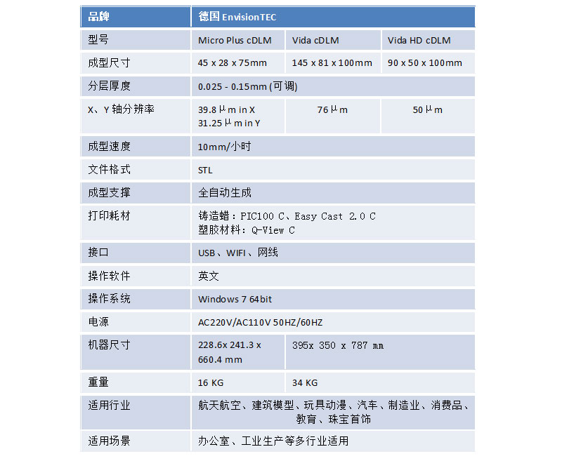 Micro/Vida cDLM 连续数字光制造3D打印机技术参数: