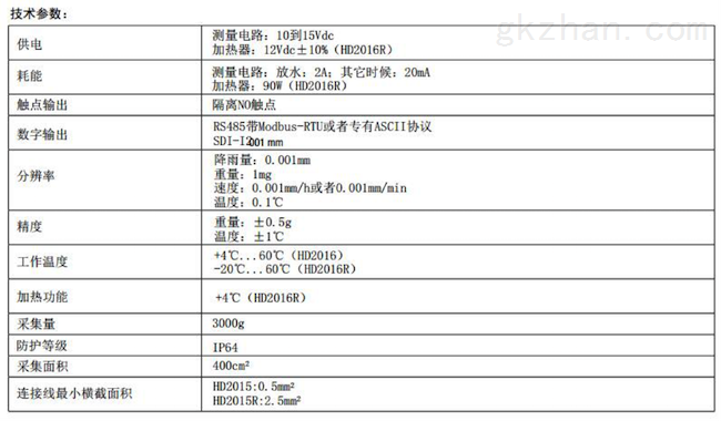 HD2016称重式雨量计的雨量采集面积为400cm2。多种输出可选: