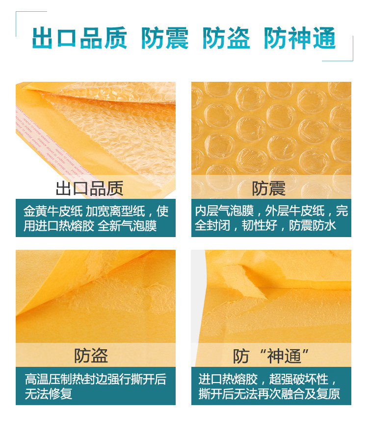 产品用料:110克牛皮纸淋膜+60克全新料气泡膜+高温高粘热熔胶+进口离型纸(易撕条)